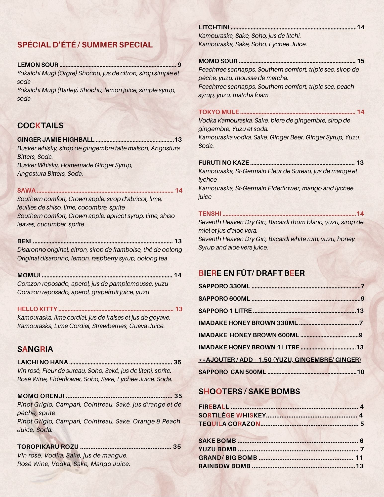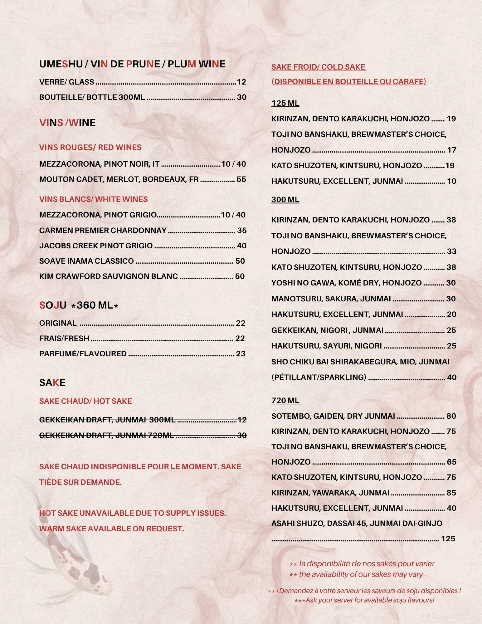 Menu des boissons
